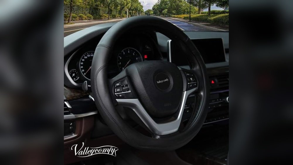 This Valleycomfy Microfiber Leather Steering Wheel Cover fits most 15-inch wheels perfectly. Its soft leather feels comfortable and improves grip while driving. The black color adds a sleek, stylish look to any car interior. Easy to install and clean, it keeps your steering wheel protected from wear and tear. A practical choice for daily use and long drives.