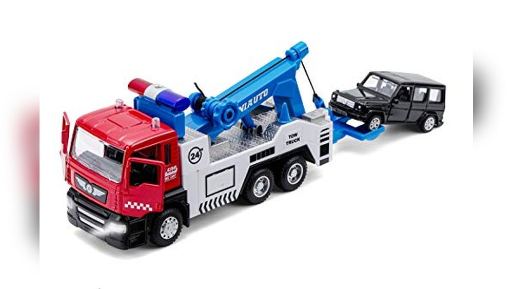 1. haomsj Toy Tow Truck Pull Back Toy Cars Miniature Carrier Truck Toy for Boys and Girls, Lights and Sound